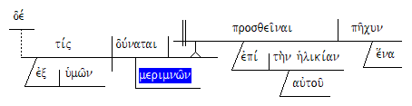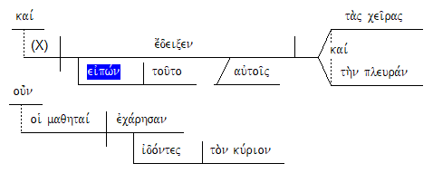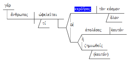 - δεξάμενος (menerima) jika diparsing participle, aorist, middle, nominative, masculine, singular. Danἄξων (memimpin) jika diparsing participle future, nominative masculine, singular.